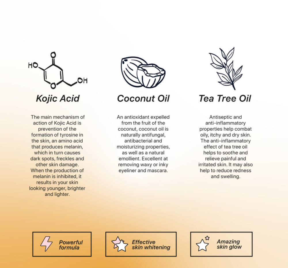 - تفتيح وتوحيد لون البشرة: يحتوي على حمض الكوجيك الذي يقلل مظهر التصبغات والبقع الناتجة عن الشمس والتقدم في العمر.